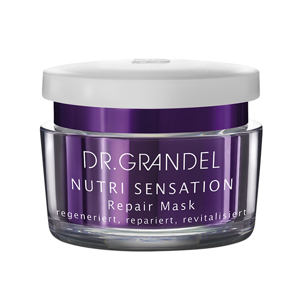 DR. GRANDEL Repair Mask to kremowa, regenerująca kuracja dla dojrzałej, wymagającej skóry. Recepturę kremu tworzy wysokocząsteczkowy kwas hialuronowy zamknięty w wielowarstwowy liposom. Ten wariant kwasu hialuronowego magazynowany jest w skórze, a uwalniany z liposomu stopniowo co pewien czas. Takie rozwiązanie zapewnia permanentne nawilżenie i zapobiega uczuciu napięcia skóry. Alantoina wspomaga regenerację komórek, wycisza podrażnienia, zapewnia zestresowanej skórze natychmiastowe odprężenie oraz wygładza i uelastycznia szorstką i spierzchniętą skórę. Charakterystyczny dla linii Nutri Sensation olej z pestek malin to lekki olej i skoncentrowany koktajl odżywczy dla skóry z witaminami i ważnymi niezbędnymi kwasami tłuszczowymi (kwasy tłuszczowe omega-3 i omega-6) w jednym. Jego struktura przypomina budową ceramidy naszej naturalnej bariery skórnej. To zapewnia doskonałe wchłanianie, a także ochronę skóry przed nadmierną utratą wilgoci. Zawarty w masce olej z nasion krokosza barwierskiego bogaty jest w niezbędne nienasycone kwasy tłuszczowe, zwłaszcza kwas linolowy. Jest to tzw. „suchy olej”, który nie pozostawia tłustego połysku na skórze. Olejek z krokosza barwierskiego poprawia zdolność wiązania wilgoci i utrzymuje skórę miękką i elastyczną.