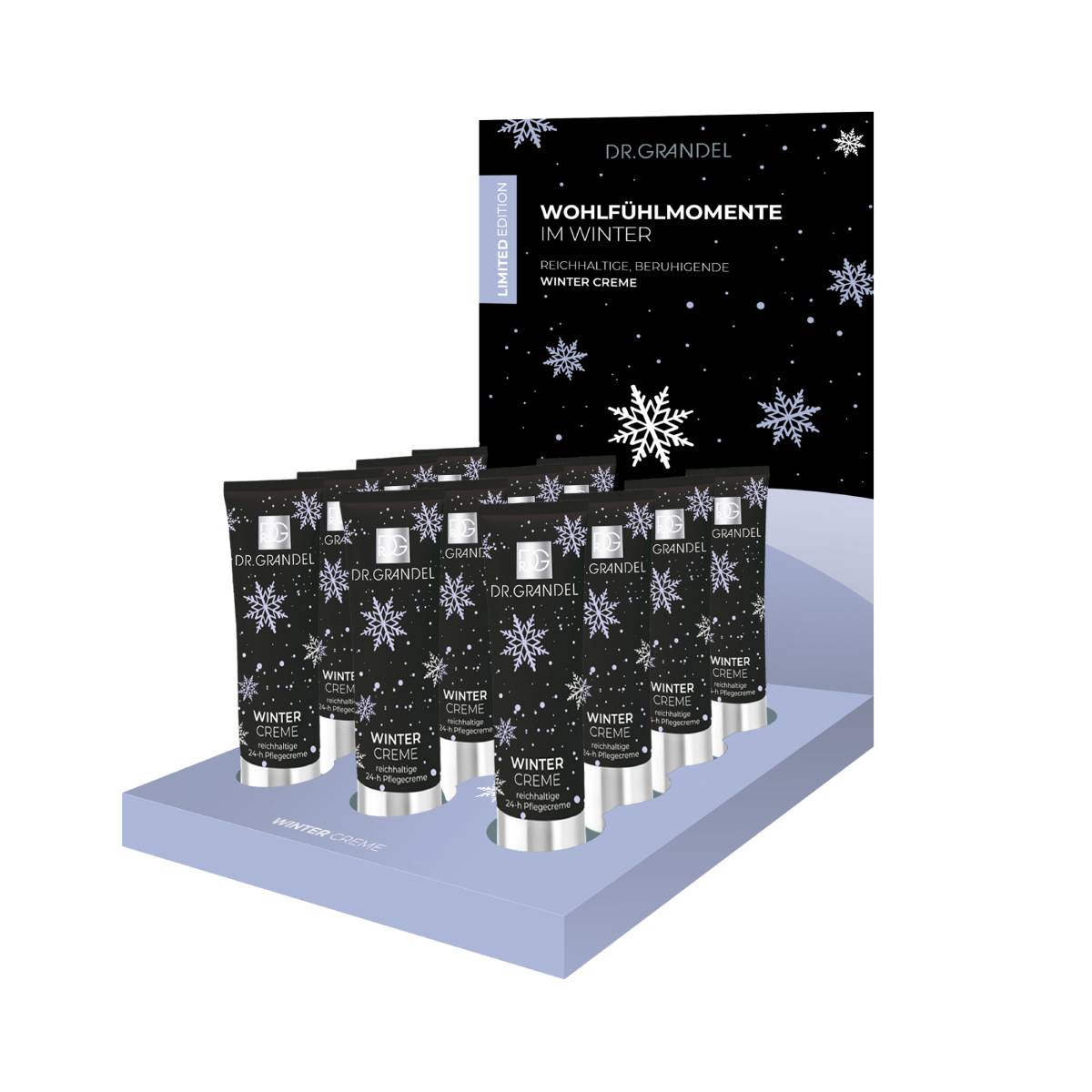 Elegancki Display zawierający 12 kremów Winter Cream do ustawienia na recepcji lub w innym widocznym miejscu w Salonie w celu wspomagania sprzedaży kosmetyków.