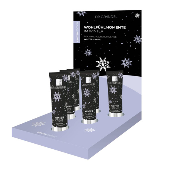 Elegancki Display zawierający 6 kremów Winter Cream do ustawienia na recepcji lub w innym widocznym miejscu w Salonie w celu wspomagania sprzedaży kosmetyków.